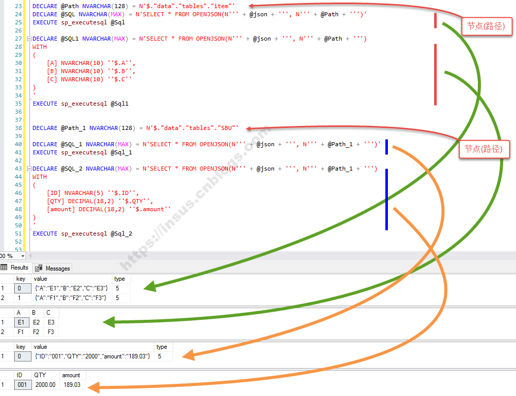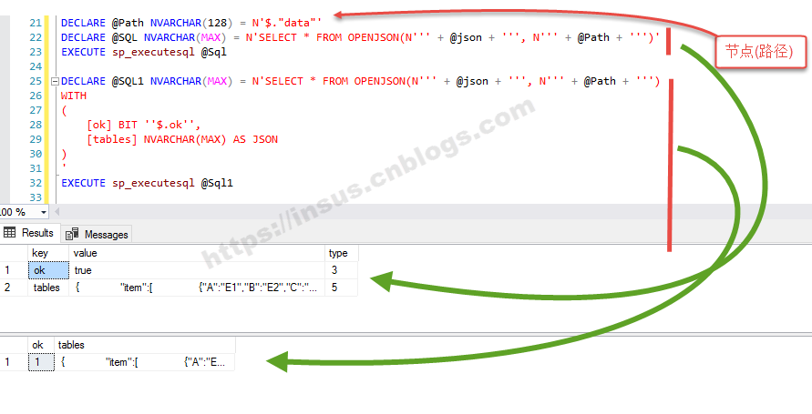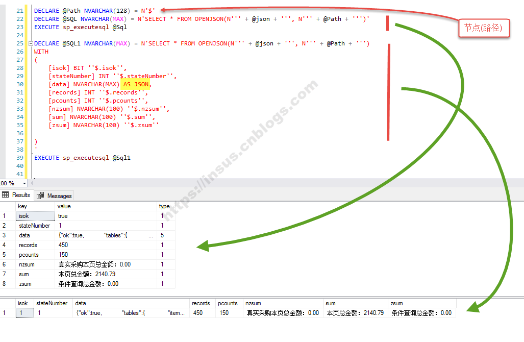 DECLARE @Path NVARCHAR(128) = N'$' DECLARE @SQL NVARCHAR(MAX) = N'SELECT * FROM OPENJSON(N''' + @json + ''', N''' + @Path + ''')' EXECUTE sp_executesql @Sql DECLARE @SQL1 NVARCHAR(MAX) = N'SELECT * FROM OPENJSON(N''' + @json + ''', N''' + @Path + ''') WITH ( [isok] BIT ''$.isok'', [stateNumber] INT ''$.stateNumber'', [data] NVARCHAR(MAX) AS JSON, [records] INT ''$.records'', [pcounts] INT ''$.pcounts'', [nzsum] NVARCHAR(100) ''$.nzsum'', [sum] NVARCHAR(100) ''$.sum'', [zsum] NVARCHAR(100) ''$.zsum'' ) ' EXECUTE sp_executesql @Sql1