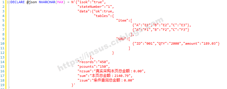 DECLARE @json NVARCHAR(MAX) = N'{"isok":"true", "stateNumber":"1", "data":{"ok":true, "tables":{ "item":[ {"A":"E1","B":"E2","C":"E3"}, {"A":"F1","B":"F2","C":"F3"} ], "SBU":[ {"ID":"001","QTY":"2000","amount":"189.03"} ] } }, "records":"450", "pcounts":"150", "nzsum":"真实采购本页总金额:0.00", "sum":"本页总金额:2140.79", "zsum":"条件查询总金额:0.00" }'