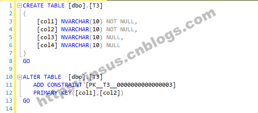 CREATE TABLE [dbo].[T3] ( [col1] NVARCHAR(10) NOT NULL, [col2] NVARCHAR(10) NOT NULL, [col3] NVARCHAR(10) NULL, [col4] NVARCHAR(10) NULL ) GO ALTER TABLE [dbo].[T3] ADD CONSTRAINT [PK__T3__0000000000000003] PRIMARY KEY([col1],[col2]) GO