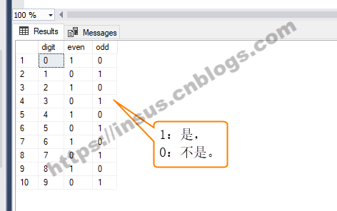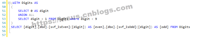 ;WITH Digits AS ( SELECT 0 AS digit UNION ALL SELECT digit + 1 FROM Digits where digit < 9 ) SELECT [digit],[dbo].[svf_IsEven]([digit]) AS [even],[dbo].[svf_IsOdd]([digit]) AS [odd] FROM Digits