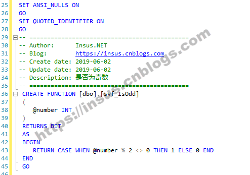 SET ANSI_NULLS ON GO SET QUOTED_IDENTIFIER ON GO -- ============================================= -- Author: Insus.NET -- Blog: https://insus.cnblogs.com -- Create date: 2019-06-02 -- Update date: 2019-06-02 -- Description: 是否为奇数 -- ============================================= CREATE FUNCTION [dbo].[svf_IsOdd] ( @number INT ) RETURNS BIT AS BEGIN RETURN CASE WHEN @number % 2 <> 0 THEN 1 ELSE 0 END END GO