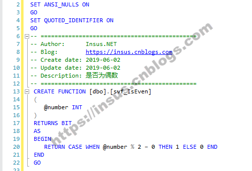 SET ANSI_NULLS ON GO SET QUOTED_IDENTIFIER ON GO -- ============================================= -- Author: Insus.NET -- Blog: https://insus.cnblogs.com -- Create date: 2019-06-02 -- Update date: 2019-06-02 -- Description: 是否为偶数 -- ============================================= CREATE FUNCTION [dbo].[svf_IsEven] ( @number INT ) RETURNS BIT AS BEGIN RETURN CASE WHEN @number % 2 = 0 THEN 1 ELSE 0 END END GO