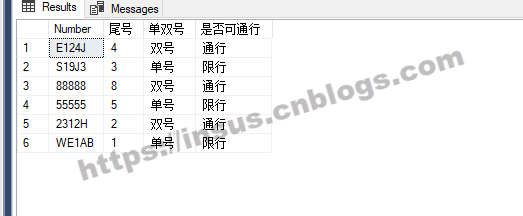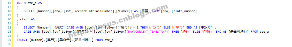 ;WITH cte_a AS ( SELECT [Number],[dbo].[svf_LicensePlateTailNumber]([Number]) AS [尾号] FROM [dbo].[plate_number] ) , cte_b AS ( SELECT [Number], [尾号],CASE WHEN [dbo].[svf_IsEven]([尾号]) = 1 THEN N'双号' ELSE N'单号' END AS [单双号] , CASE WHEN [dbo].[svf_IsEven]([尾号]) = [dbo].[svf_IsEven](DAY(CURRENT_TIMESTAMP)) THEN '通行' ELSE N'限行' END AS [是否可通行] FROM cte_a ) SELECT [Number],[尾号],[单双号],[是否可通行] FROM cte_b