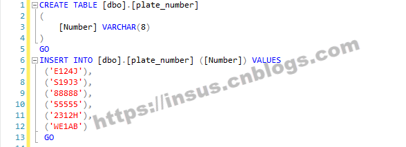 CREATE TABLE [dbo].[plate_number] ( [Number] VARCHAR(8) ) GO INSERT INTO [dbo].[plate_number] ([Number]) VALUES ('E124J'), ('S19J3'), ('88888'), ('55555'), ('2312H'), ('WE1AB') GO