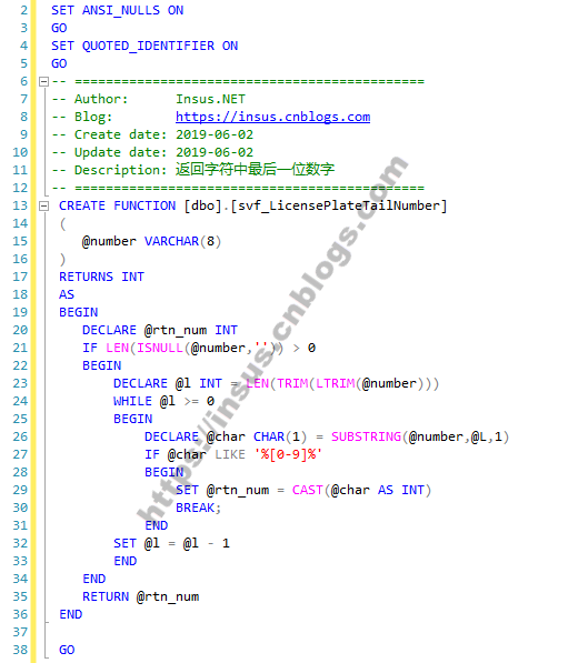 SET ANSI_NULLS ON GO SET QUOTED_IDENTIFIER ON GO -- ============================================= -- Author: Insus.NET -- Blog: https://insus.cnblogs.com -- Create date: 2019-06-02 -- Update date: 2019-06-02 -- Description: 返回字符中最后一位数字 -- ============================================= CREATE FUNCTION [dbo].[svf_LicensePlateTailNumber] ( @number VARCHAR(8) ) RETURNS INT AS BEGIN DECLARE @rtn_num INT IF LEN(ISNULL(@number,'')) > 0 BEGIN DECLARE @l INT = LEN(TRIM(LTRIM(@number))) WHILE @l >= 0 BEGIN DECLARE @char CHAR(1) = SUBSTRING(@number,@L,1) IF @char LIKE '%[0-9]%' BEGIN SET @rtn_num = CAST(@char AS INT) BREAK; END SET @l = @l - 1 END END RETURN @rtn_num END GO