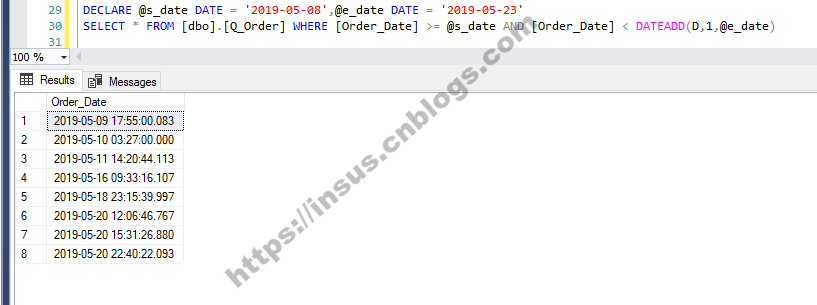 --查询某段时间之间的记录: DECLARE @s_date DATE = '2019-05-08',@e_date DATE = '2019-05-23' SELECT * FROM [dbo].[Q_Order] WHERE [Order_Date] >= @s_date AND [Order_Date] < DATEADD(D,1,@e_date)