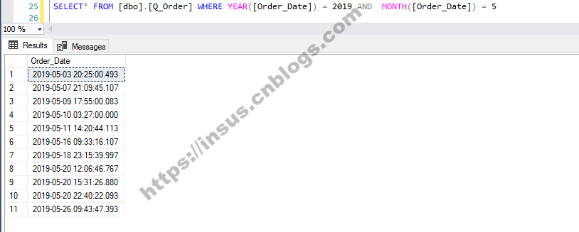 --查询2019年5月份的记录: SELECT* FROM [dbo].[Q_Order] WHERE YEAR([Order_Date]) = 2019 AND MONTH([Order_Date]) = 5