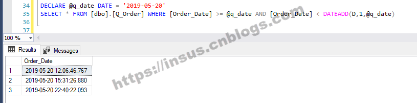 --查询某一天的记录 DECLARE @q_date DATE = '2019-05-20' SELECT * FROM [dbo].[Q_Order] WHERE [Order_Date] >= @q_date AND [Order_Date] < DATEADD(D,1,@q_date)