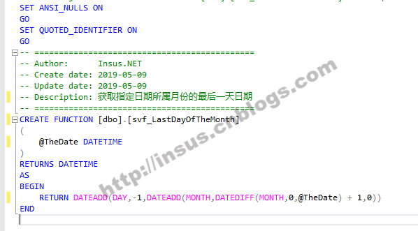 SET ANSI_NULLS ON GO SET QUOTED_IDENTIFIER ON GO -- ============================================= -- Author: Insus.NET -- Create date: 2019-05-09 -- Update date: 2019-05-09 -- Description: 获取指定日期所属月份的最后一天日期 -- ============================================= CREATE FUNCTION [dbo].[svf_LastDayOfTheMonth] ( @TheDate DATETIME ) RETURNS DATETIME AS BEGIN RETURN DATEADD(DAY,-1,DATEADD(MONTH,DATEDIFF(MONTH,0,@TheDate) + 1,0)) END