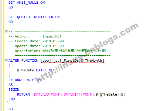 SET ANSI_NULLS ON GO SET QUOTED_IDENTIFIER ON GO -- ============================================= -- Author: Insus.NET -- Create date: 2019-05-09 -- Update date: 2019-05-09 -- Description: 获取指定日期所属月份的第一天日期 -- ============================================= ALTER FUNCTION [dbo].[svf_FirstDayOfTheMonth] ( @TheDate DATETIME ) RETURNS DATETIME AS BEGIN RETURN DATEADD(MONTH,DATEDIFF(MONTH,0,@TheDate),0) END GO