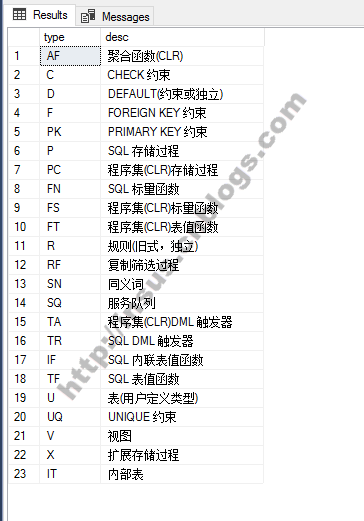 IF OBJECT_ID('tempdb.dbo.#type') IS NOT NULL DROP TABLE #type CREATE TABLE #type ( [type] NVARCHAR(2), [desc] NVARCHAR(30) ) INSERT INTO #type ([type],[desc]) VALUES (N'AF',N'聚合函数(CLR)'), (N'C',N'CHECK 约束'), (N'D',N'DEFAULT(约束或独立)'), (N'F',N'FOREIGN KEY 约束'), (N'PK',N'PRIMARY KEY 约束'), (N'P',N'SQL 存储过程'), (N'PC',N'程序集(CLR)存储过程'), (N'FN',N'SQL 标量函数'), (N'FS',N'程序集(CLR)标量函数'), (N'FT',N'程序集(CLR)表值函数'), (N'R',N'规则(旧式,独立)'), (N'RF',N'复制筛选过程'), (N'SN',N'同义词'), (N'SQ',N'服务队列'), (N'TA',N'程序集(CLR)DML 触发器'), (N'TR',N'SQL DML 触发器'), (N'IF',N'SQL 内联表值函数'), (N'TF',N'SQL 表值函数'), (N'U',N'表(用户定义类型)'), (N'UQ',N'UNIQUE 约束'), (N'V',N'视图'), (N'X',N'扩展存储过程'), (N'IT',N'内部表') SELECT [type],[desc] FROM #type