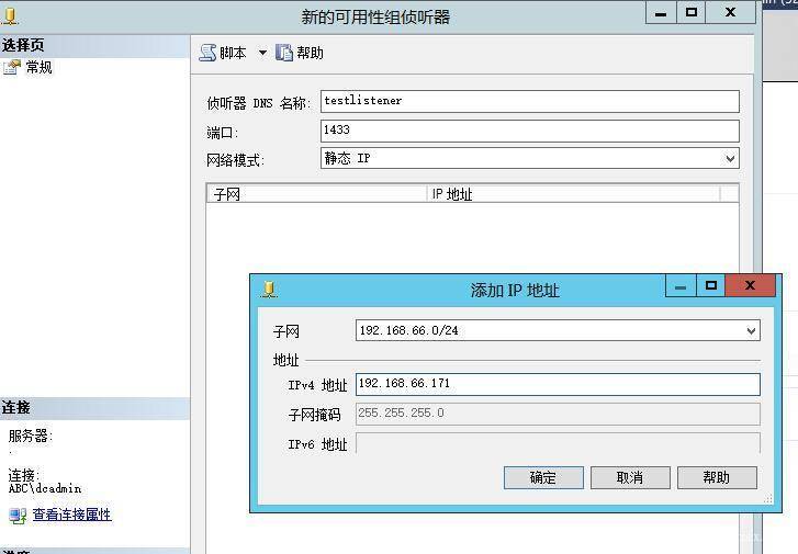 20、在创建可用性组后,在“可用性组侦听器”上右键添加侦听器来创建侦听器,选择静态IP的网络模式(尽量不要选择DHCP网络模式),