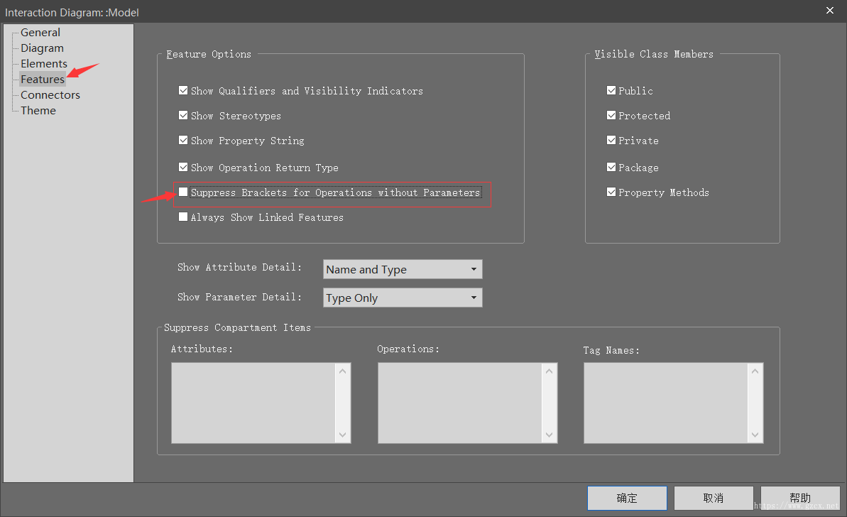 在箭头上输入文字,填写消息名称,并给出相关编号,如1.1//这里需要在编号后加双斜线,然后发现多了一组空的括号,快捷键F5,选择Features,将倒数第二个勾选,取消无参数操作的括号,就可以将括号去掉了