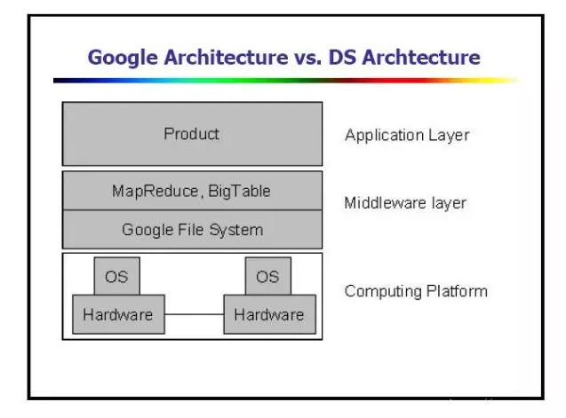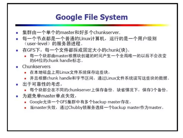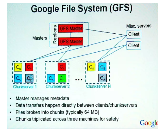 2003年,Google发布Google File System论文,这是一个可扩展的分布式文件系统,用于大型的、分布式的、对大量数据进行访问的应用。它运行于廉价的普通硬件上,提供容错功能。从根本上说:文件被分割成很多块,使用冗余的方式储存于商用机器集群上。