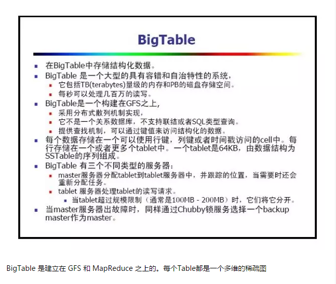 为了管理巨大的Table,把Table根据行分割,这些分割后的数据统称为:Tablets。每个Tablets大概有 100-200 MB,每个机器存储100个左右的 Tablets。底层的架构是:GFS。