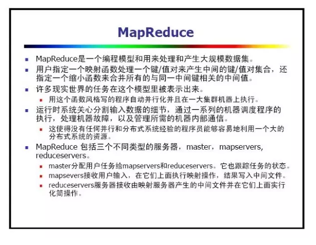 Mapreduce由Map和reduce组成,来自于Lisp,Map是影射,把指令分发到多个worker上去,reduce是规约,把Map的worker计算出来的结果合并。Mapreduce使用GFS存储数据。